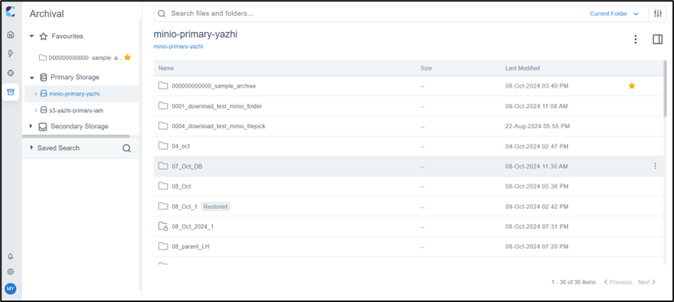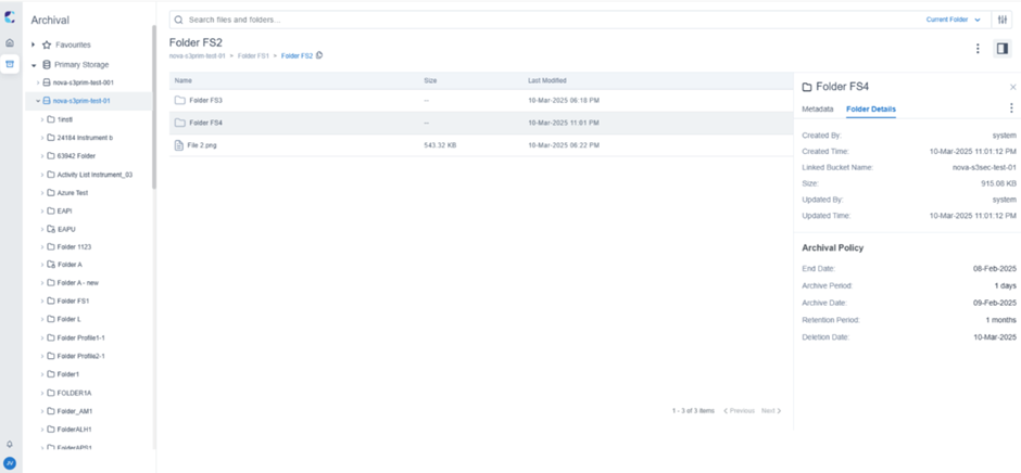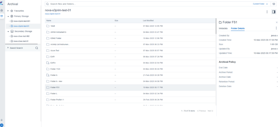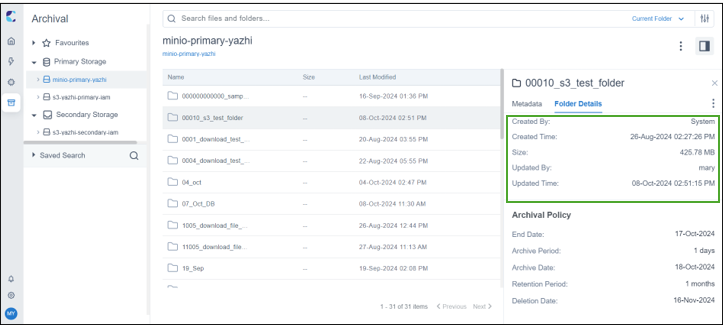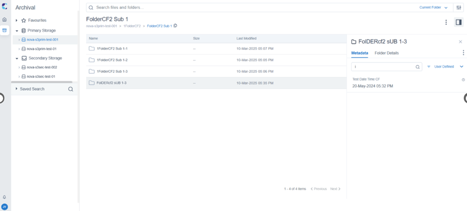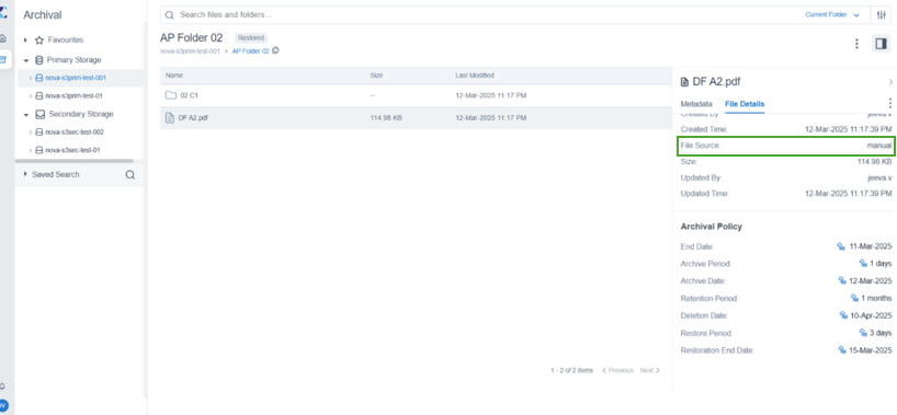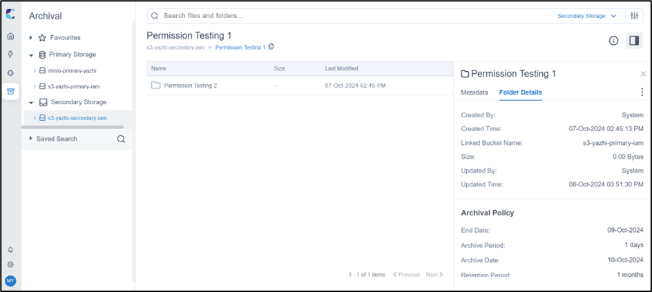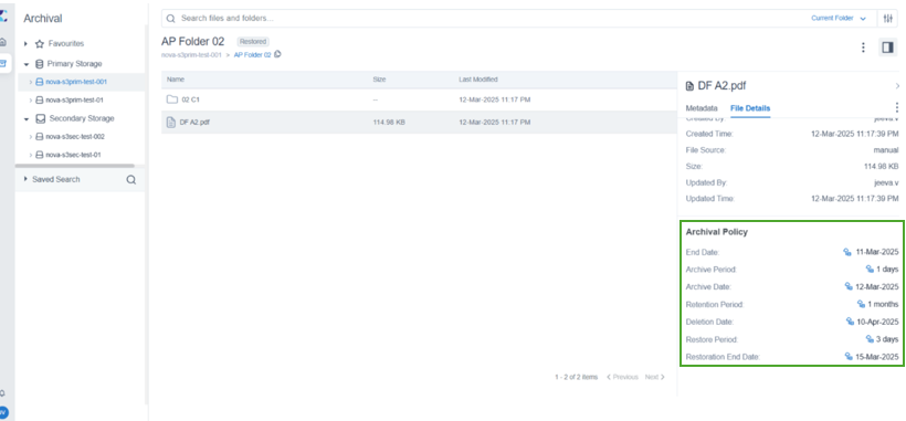 There is a folder named "Folder A," which contains a child folder called "Folder 1." After the archival period, both Folder A and Folder 1 are moved to secondary storage. If you restore only Folder 1 from secondary storage, it will be restored to primary storage, while Folder A will remain in secondary storage. When you view Folder 1, you will see Folder A listed as its parent, but you won't be able to open it.