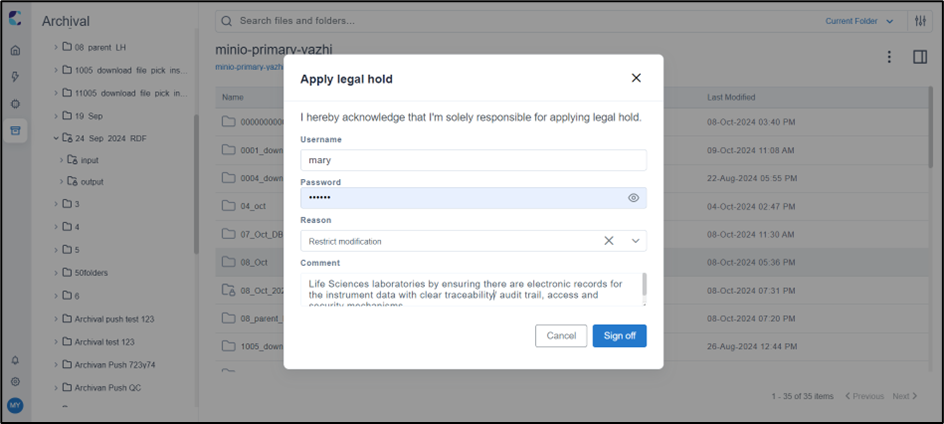 To restrict archival actions and prevent any edits, a file or folder can be placed on legal hold, which also applies to all its associated child folders and files until the legal hold is lifted. This page provides you an instruction on how to implement legal holds on files and folders.
