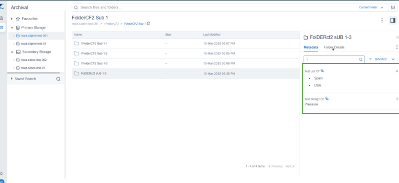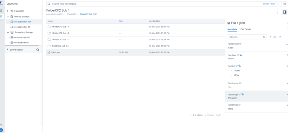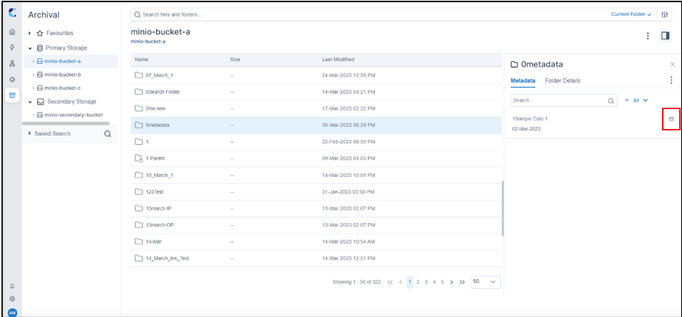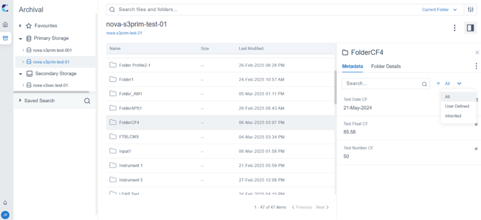The values for user-defined metadata can be edited as long as the file or folder remains in primary storage. Once it moves to secondary storage, the metadata values become non-editable. However, if necessary, you can restore the folder to primary storage to make its metadata editable again.