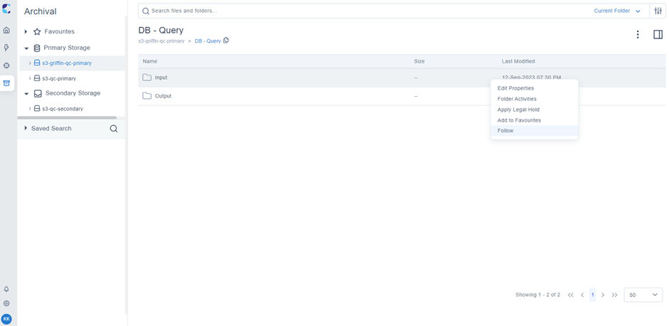 To receive notifications or emails about a folder or file, click the Follow button. Navigating to a specific path will display the folder or file list under that path.