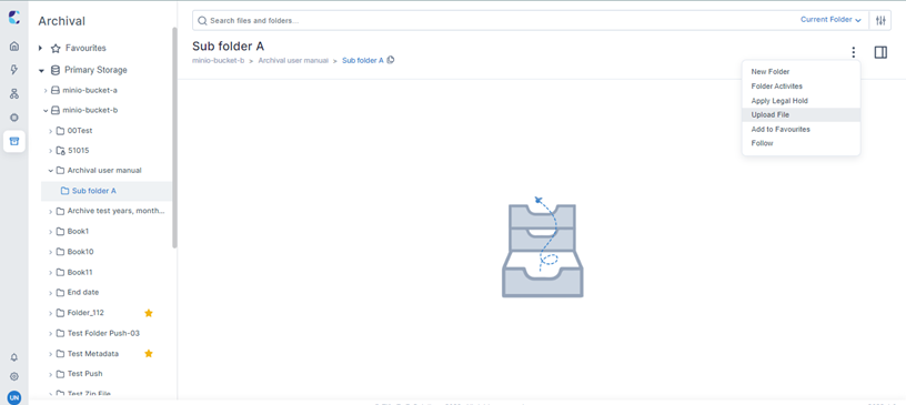 This section guides you through various methods for uploading files to Archival. Files can be uploaded to a folder in primary storage. Additionally, refer to the sections in Instrument Integration to learn how to schedule files for automatic archival.