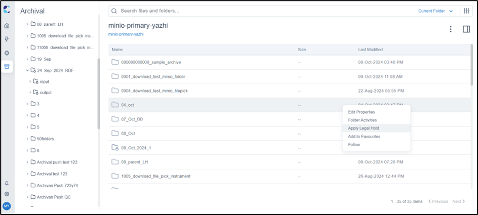 - Utilize the 'Apply Legal Hold' menu option to place a file or folder under legal hold.