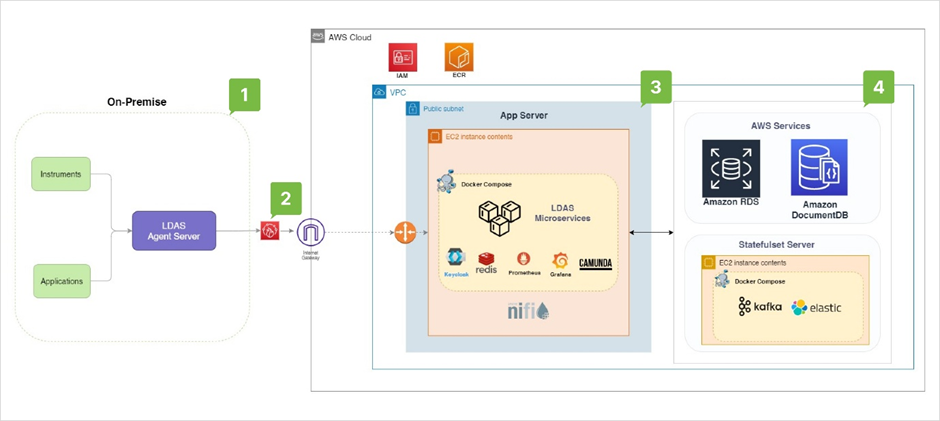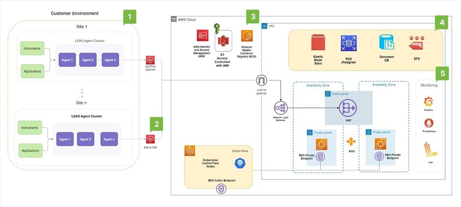 - On-premises agents and applications across multiple customer sites connect securely to LDAS Cloud services on AWS using network firewalls or AWS Direct Connect, ensuring encrypted data transmission and protection against unauthorized access.