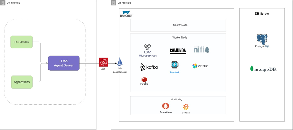- A secure connection is established between instruments and the LDAS Agent Server via port 443. This ensures authenticated communication and protects data transfer within the on-premises environment.