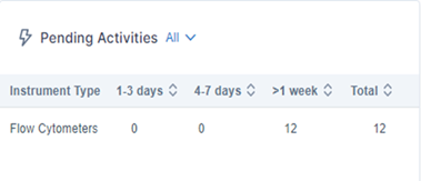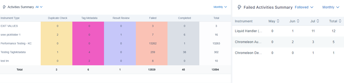 - View the data only for the followed instruments or for all instruments in the organization path. For the widgets- ‘Activities summary’, ‘Failed Activities summary’ and ‘Pending Activities’, if you choose to view the data for ‘All’ Instruments, the data would be grouped based on the instrument type and if you choose to view the data for only ‘Followed’ instruments, the data would be shown for each followed instrument.