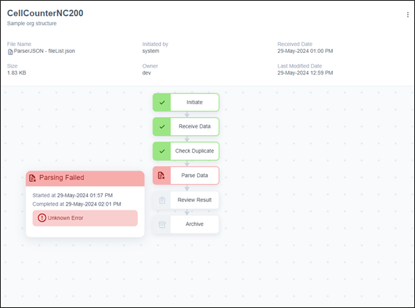 NOTE:Re-run can be initiated for failed activities at any stage prior to the failed stage. If an activity fails at the Archive stage and a re-run is initiated from the Parse Data, and subsequently fails again at the Parse Data, the activity will be marked as failed at both the Parse Data and Archive stages. The date and time of the re-run can be checked to compare details and understand the sequence of failures.