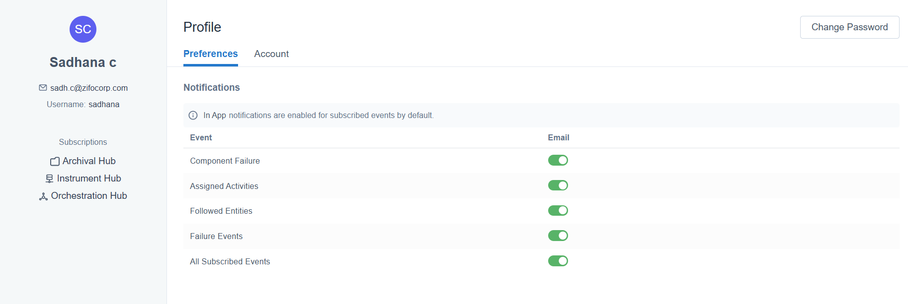 In-app and mail notification are received for Component Failure, Assigned activities, Followed entities, Failure events, All subscribed events.