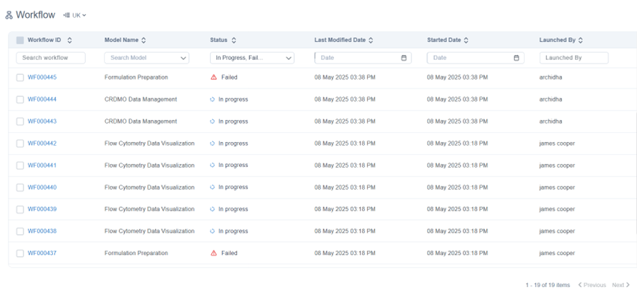 - You can filter and view workflows by model name, status (In Progress, Cancelled, Failed, Completed), or Started Date and Last modified Date using a date/time range.