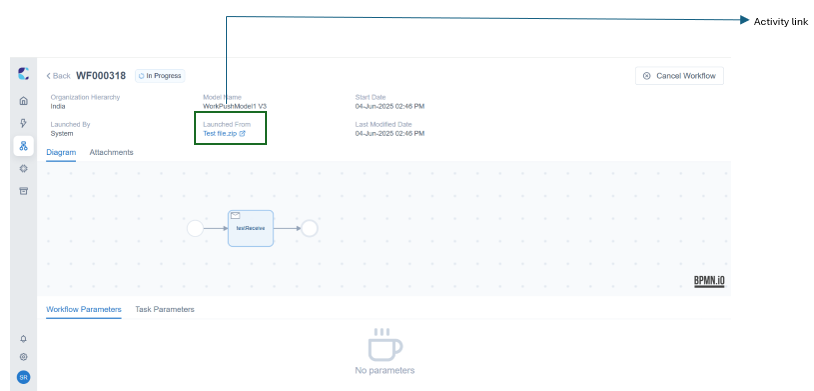 - The activity link from where the workflow was launched if the workflow is launched from Activities