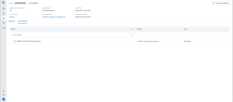 You can view the list of files associated with your workflow under the ‘Attachments’ section.
