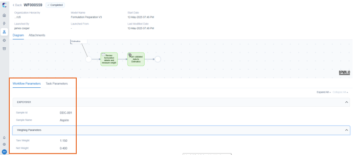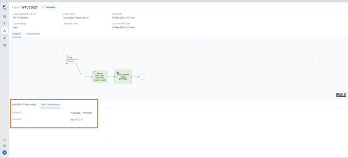 - Once the corresponding task involving the parameter is completed, you can view the task-specific parameter under the Workflow Parameters tab. To view the workflow parameter, it must be configured in the mapping config while publishing the model.