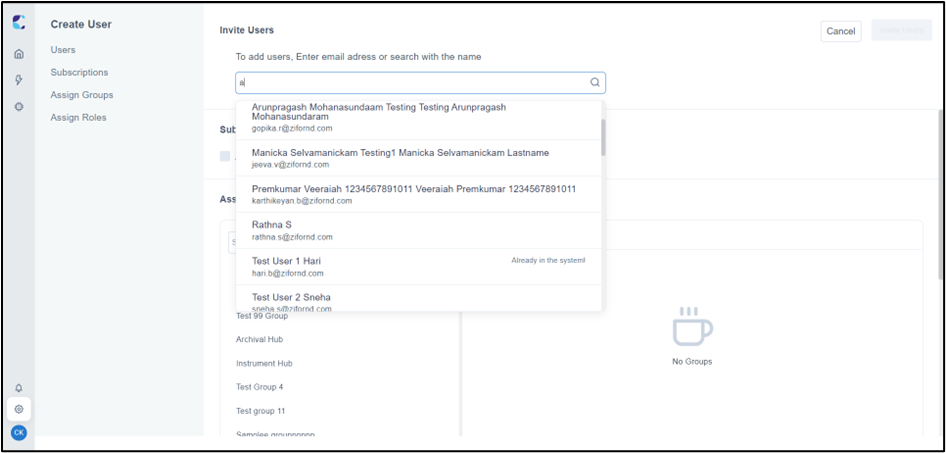 Note:The user should have First Name, Last Name, UserName, and Email address to be invited into the LDAS, otherwise these users will not be listed in the dropdown. Also, when user mail ID contains any special characters other than '-', '_', '.' and '@' will not be displayed in the dropdown.